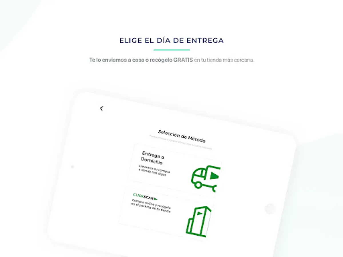 • Forget worrying about your order arriving when you are not at home. Choose the time you want Supermercado El Corte Inglés to deliver your purchase or the time you want to pick up your purchase at your preferred Click & Car point.