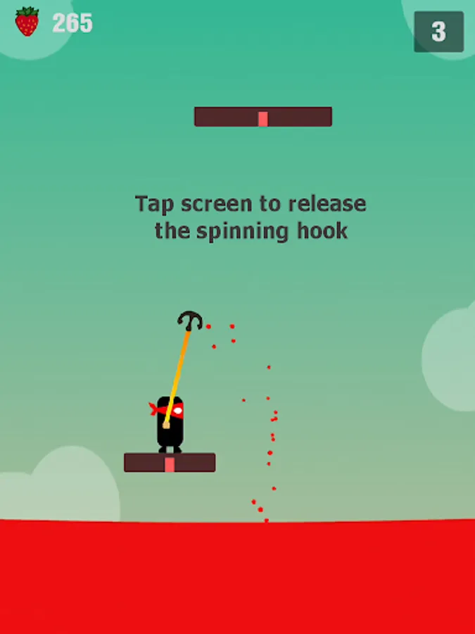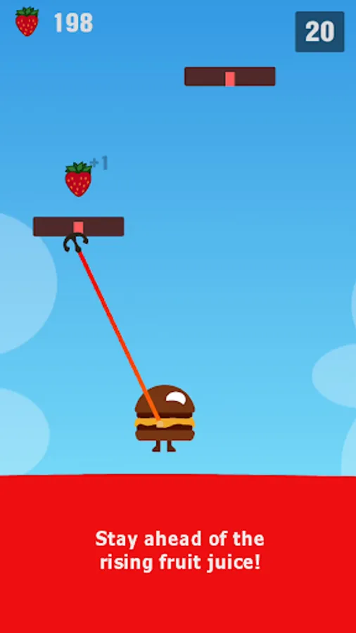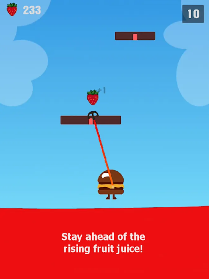 Tap the screen and release your spinning hook. Try to stick to the higher platforms and stay ahead of the rising fruit juice!