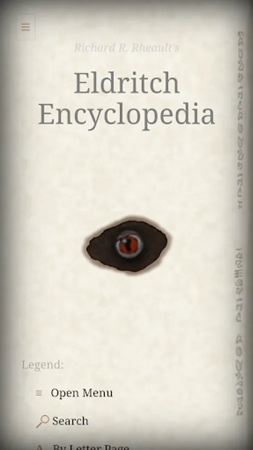 Welcome to the Eldritch Encyclopedia. This work of fiction is partially inspired by the writings and Mythos of H. P. Lovecraft author of Call of Cthulhu (1928), though set in a different reality. It blends the Horror, Fantasy and Science Fiction genres woven into an occult-themed tapestry. You will find therein, numerous references to supernatural creatures and alien entities from other worlds, as well as descriptions of paranormal powers, arcane spells and occult rituals. The Eldritch Encyclopedia is an intriguing resource for intrepid investigators in their struggle against horror, mystery and occult forces.