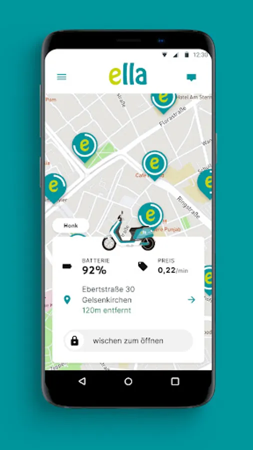 Cruising through the city flexibly, quickly and inexpensively: ella, your green city scooter for Gelsenkirchen, Bottrop and Gladbeck, makes it possible. The ella app is your key to the new e-scooter sharing from ELE - and offers you all the functions you need for relaxed scooter fun: from finding and reserving the next available ella to keyless starting and reporting the end of your trip. Simply load the ella app onto your smartphone, register once and you can whiz past traffic jams with every ella to do sports, go to the cinema or visit friends with no emissions and as quiet as a whisper. And because shared driving pleasure is double driving pleasure, every ella has two helmets on board as standard. Of course, you don't have to pay twice for the ride with a passenger, every tour with an ella is billed transparently and fairly by the minute - without any basic or starting fees. More information is available at www.ele.de/ella. Your ELE team wishes you lots of fun with ella!