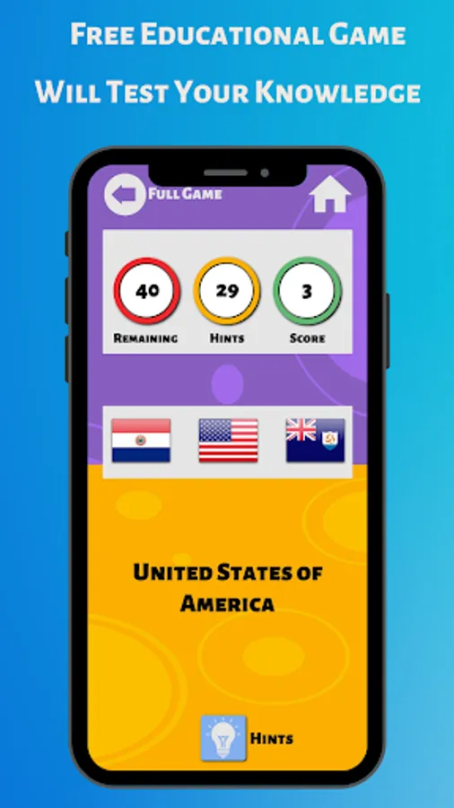 This flag game will give you a super cool hint whether or not you choose the correct answer. Just pick the right answer and you will get the bonus in each level. Just guess the flag, you will be able to play new challenging and flag quiz game. Just tap and choose the appropriate answer.