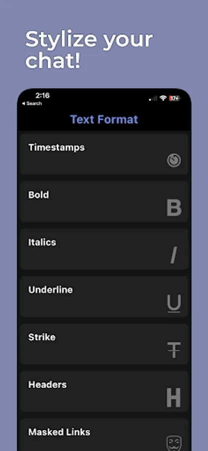 Text Format for Discord or Discord Markdown App, has a curated list of all Discord Markdowns and Text Formatting. Save the headache and select your format on a single page.