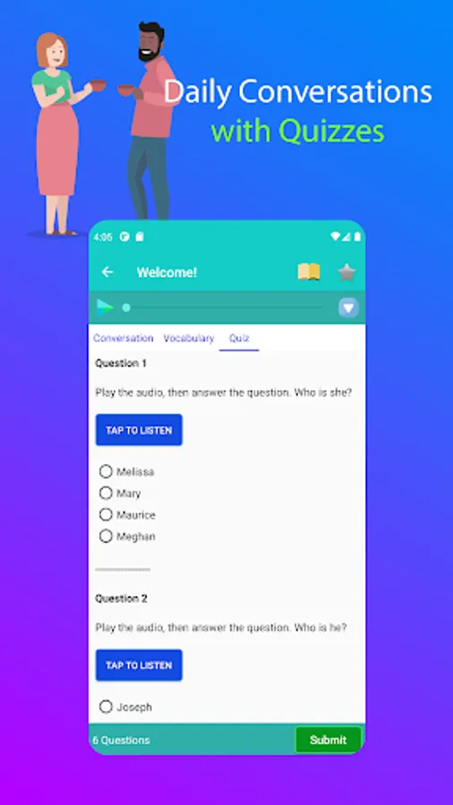 This useful English learning app contains a lot of lessons that will help you improve your English listening and speaking skills. All lessons of this app are in American English accent. You can also read the full transcript of each lesson while listening to the audios.