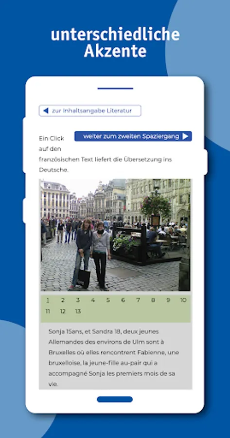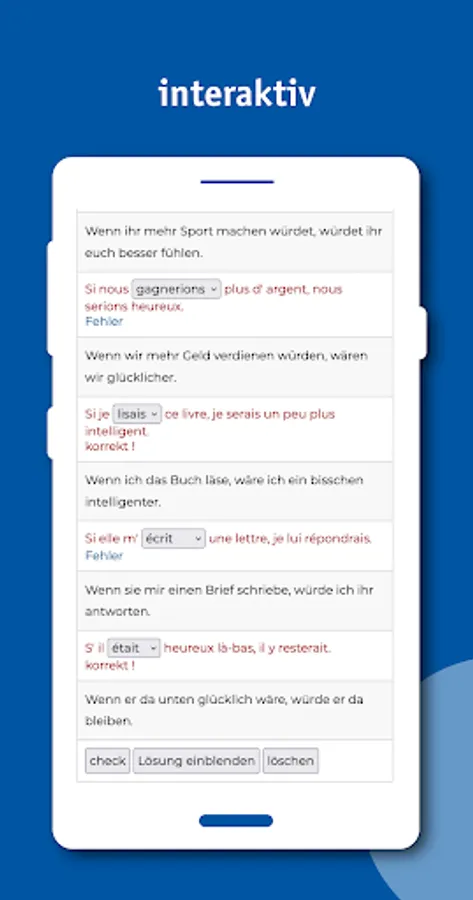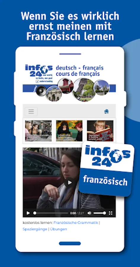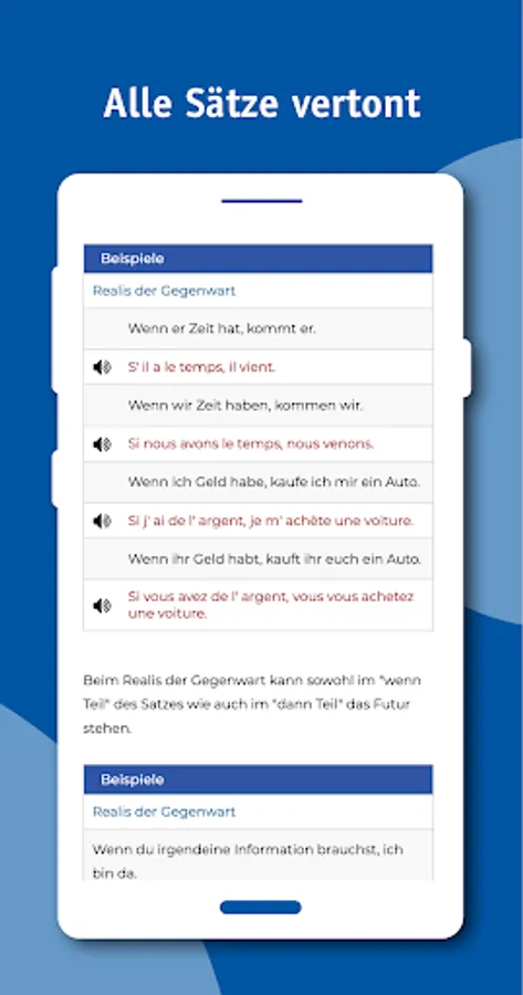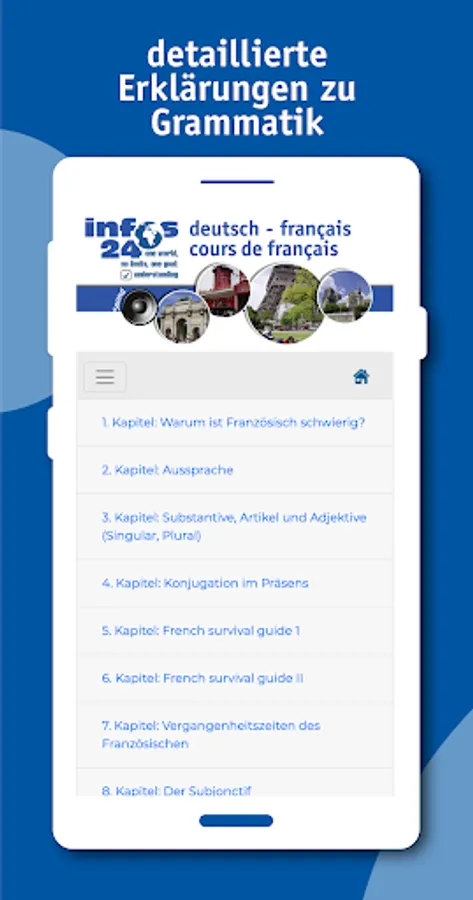 Detailed description of the French phonetic system, with thousands of examples. The grammar part is contrastive. This means that the specific problems that native German speakers face when learning French are taken into account. 600 pages of grammar with several thousand example sentences with translation, 4000 interactive exercises, several novels relevant to the French-speaking world with translation and full sound, virtual walks, multimedia.