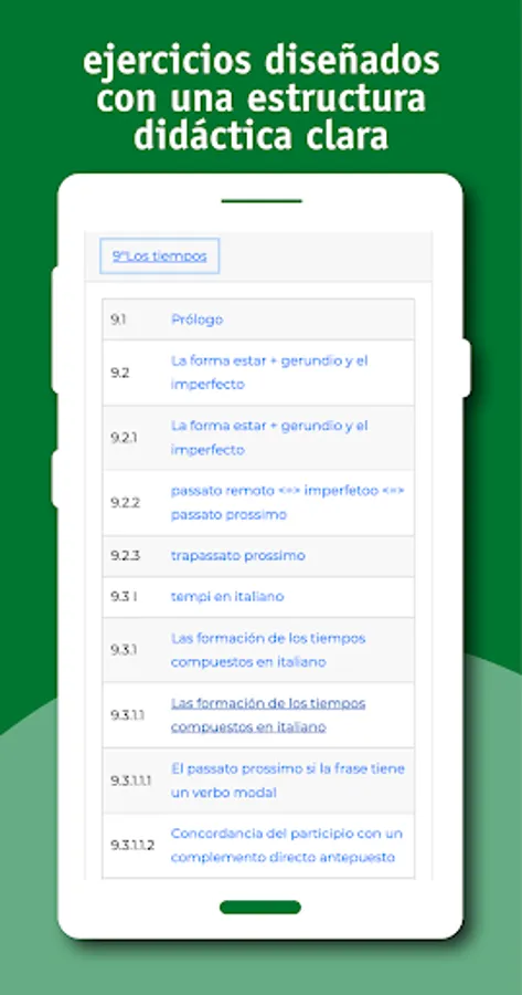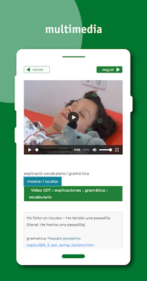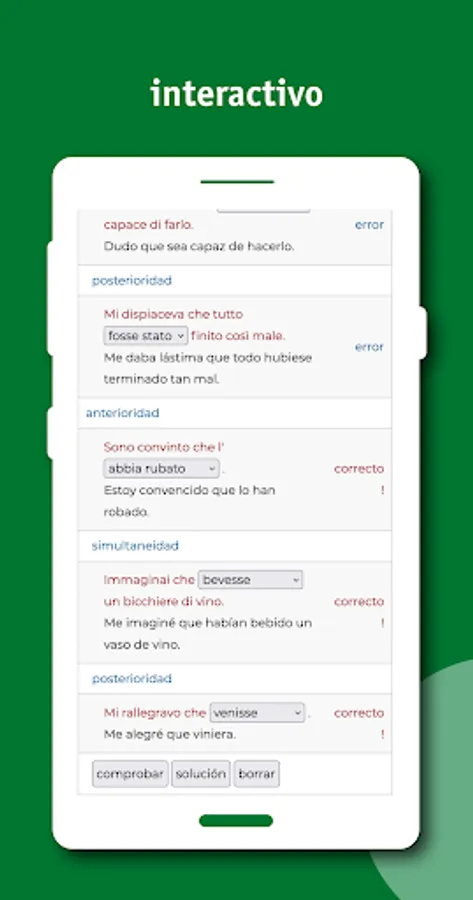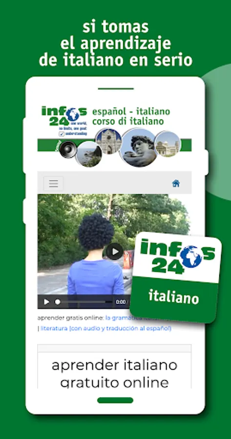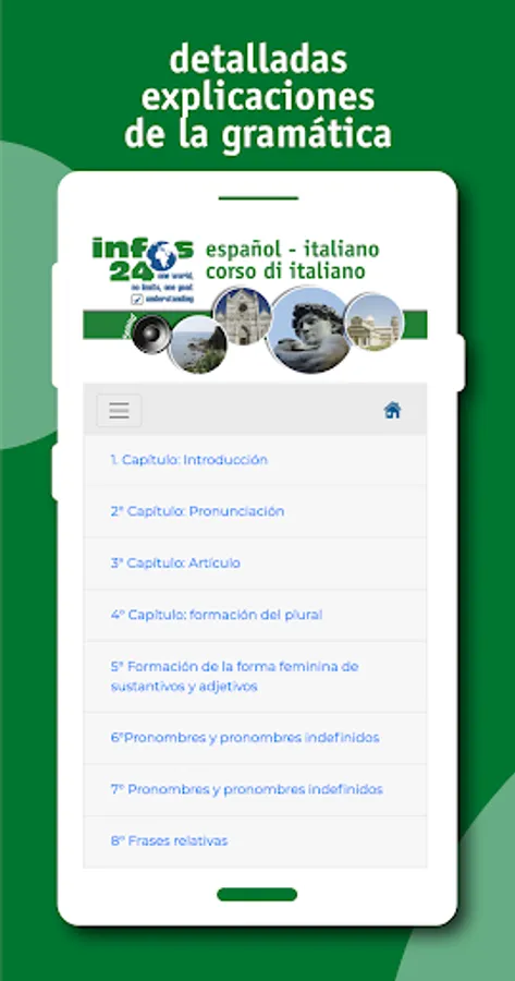 The grammatical part is contrastive. This means that the specific problems that native Spanish speakers face when learning Italian are taken into account. 600 grammar pages with several thousand example sentences with translation, 4000 interactive exercises, several important novels for the Italian-speaking world with translation and full sound, virtual walkthroughs, multimedia.