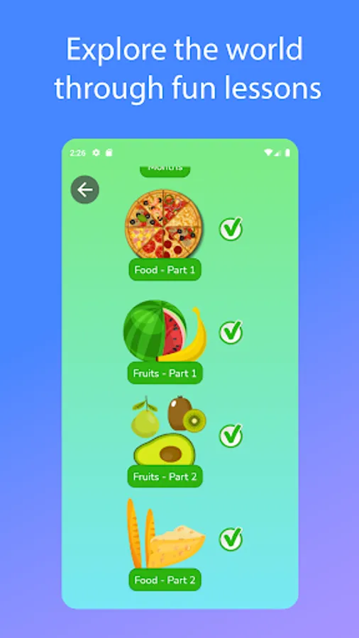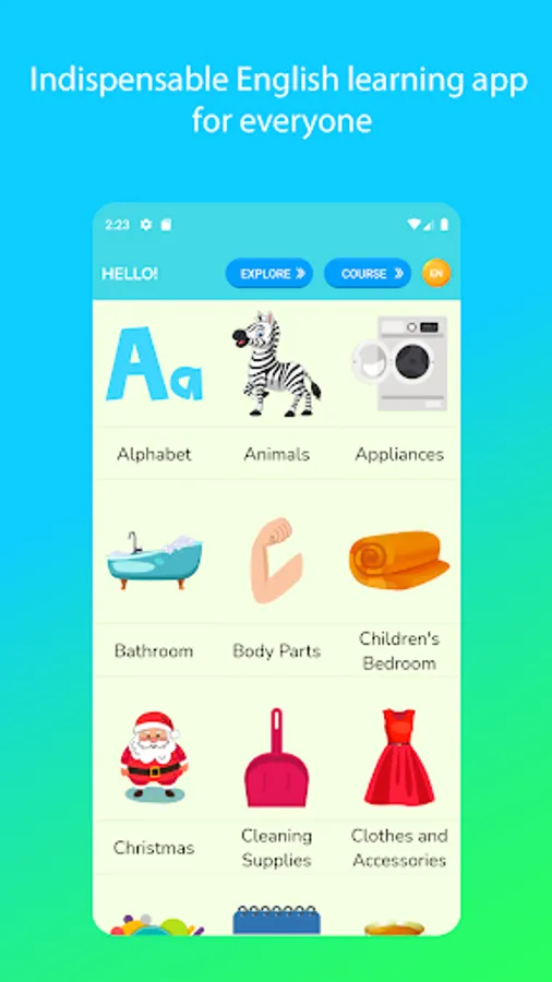 Learn English through animated and fun activities. This application will help you learn English pronunciation and remember new things in colorful pictures. You will enjoy learning by completing the lessons step by step. You can easily track your learning progress to stay motivated to complete the lessons. You will practice more than 800 English words with 40 different topics.