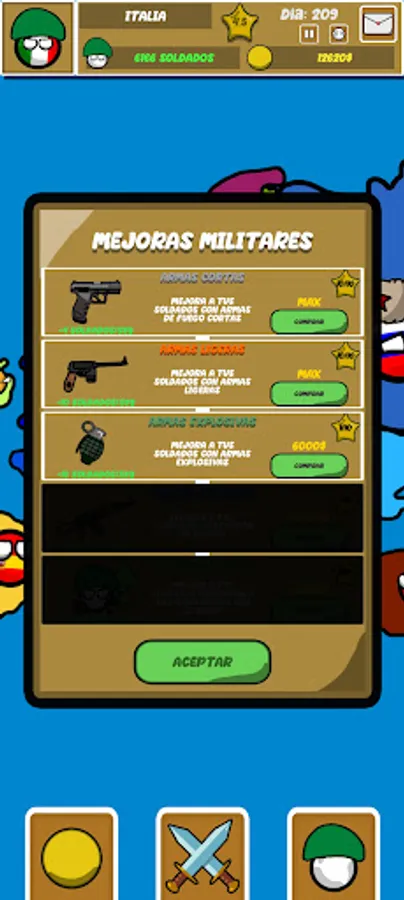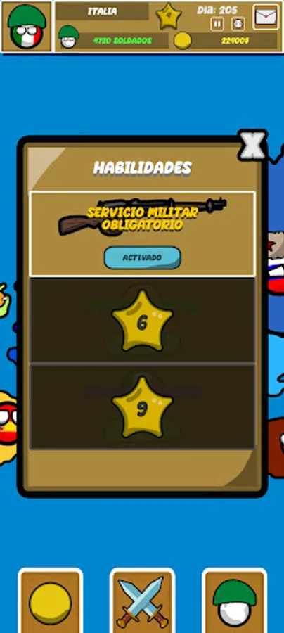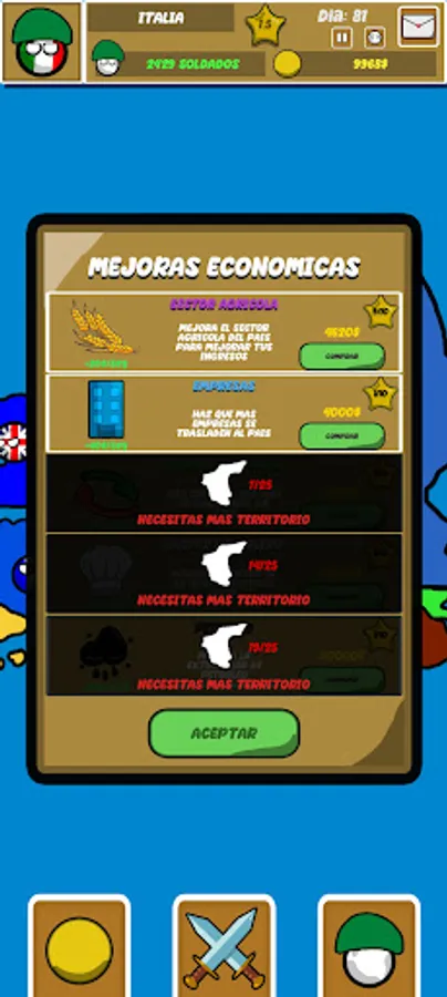 During the games you will have to improve your army to get more soldiers, when you face a country, the one with the most soldiers will win!