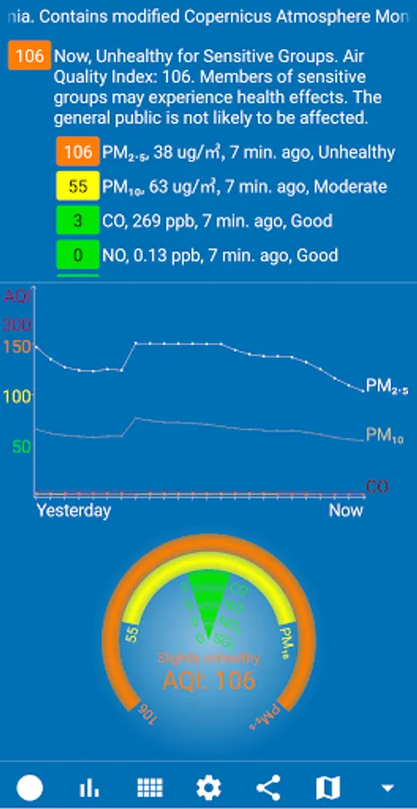 eAirQuality displays air quality index (AQI), air pollution and air matters on a map and in widgets. Concentrations of pollutants in the air are displayed from various sources: AirNow, Copernicus, ECMWF, etc.