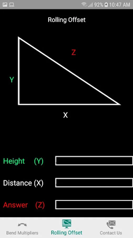 Rolling offset: This page is used to calculate rolling offsets. You need to find the height of the offset(Y) and then the distance of how far it is rolling(X). After (Z) is calculated take the (Z) calculation and go to the bend multipliers page. Plug in the (Z) calculated number into one of the bend multipliers spots(10, 22, 30, 45, 60 degrees).