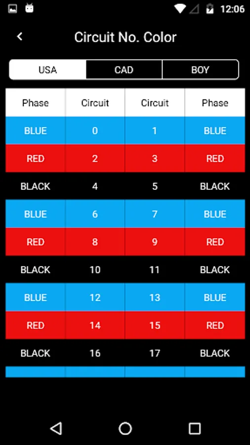 Circuit color chart: This function is used to reference 3 phase circuit colors. The charts are only intended for American and Canadian use.