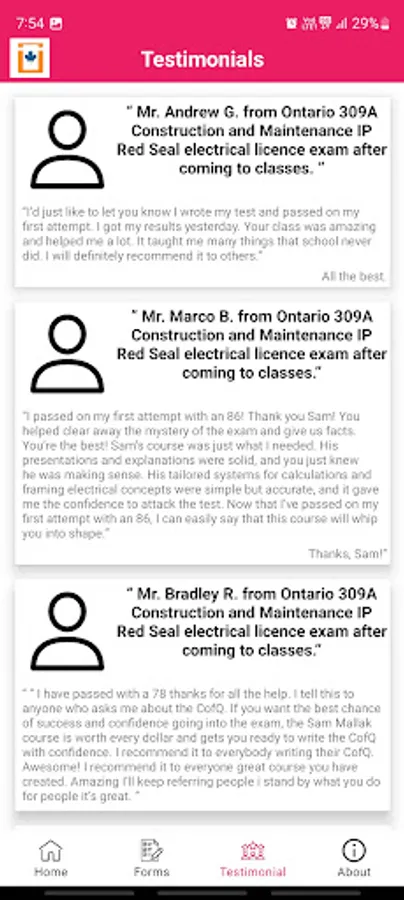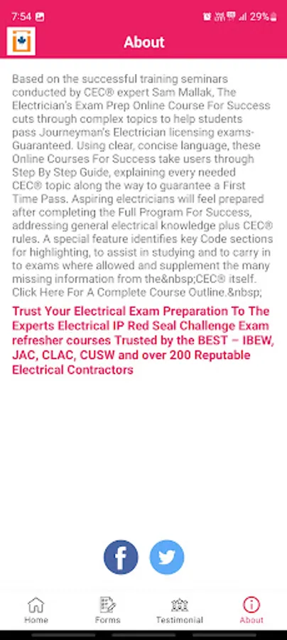 This App is for paid members only. Free to download. If you are a paid member at electricalexam.ca or electricalexamreview.com, then you need this App for convenience to access your full membership for success. Master's license (Ontario only), Construction & Maintenance, or Industrial electrical exam preparation with a 95% Success Rate. We Guarantee You Will Pass. Over 3400 students have their licenses. Call now to be well informed at (416) 841-1399.