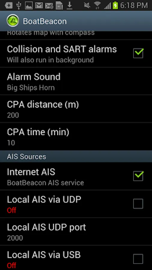 Over the horizon Collision and SART detection (30 miles radius) using continuous Closest Point of Approach (CPA) calculations - highlights boats that are on a potential collision course and alarms even when the app is in the background.
