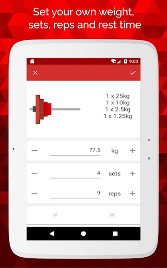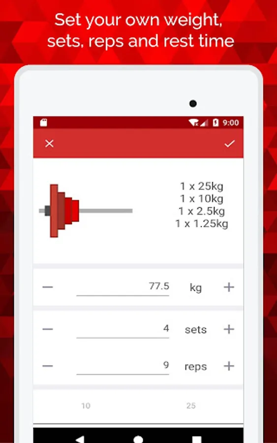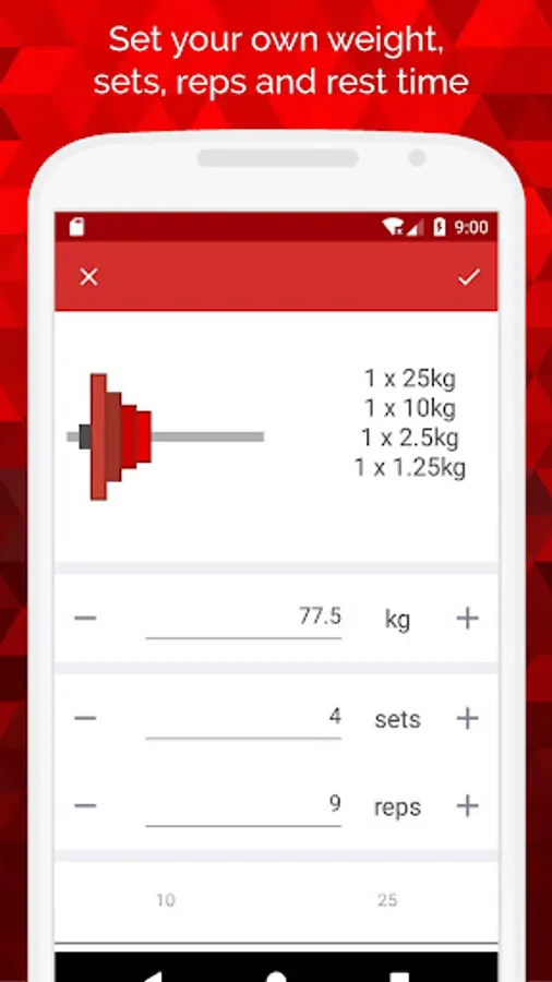 β During your workout you can see how much weight you should put on each side of the bar. Just click on sets&reps and choose your desired weight