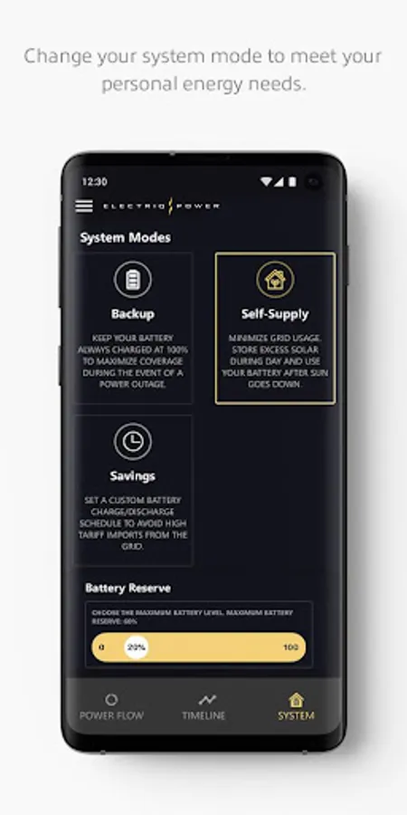 Monitor your systems power flow, energy production and consumption. Change the system mode of your PowerPod to optimize for your desired objective (backup, self-supply, savings).