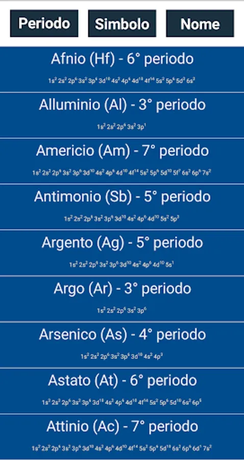 With the term electronic configuration of a chemical element, we mean the description of the arrangement of electrons in its orbitals. Each orbital is associated with an abbreviation consisting of a number and a letter. The number indicates the principal quantum number, that is, the energy level to which the orbital belongs and can assume any integer value between 1 and 7; the letter (s, p, d, f) instead indicates the secondary quantum number and therefore the type of orbital. This application reports the electronic configuration of the chemical elements, sorted by period, by symbol and by name.