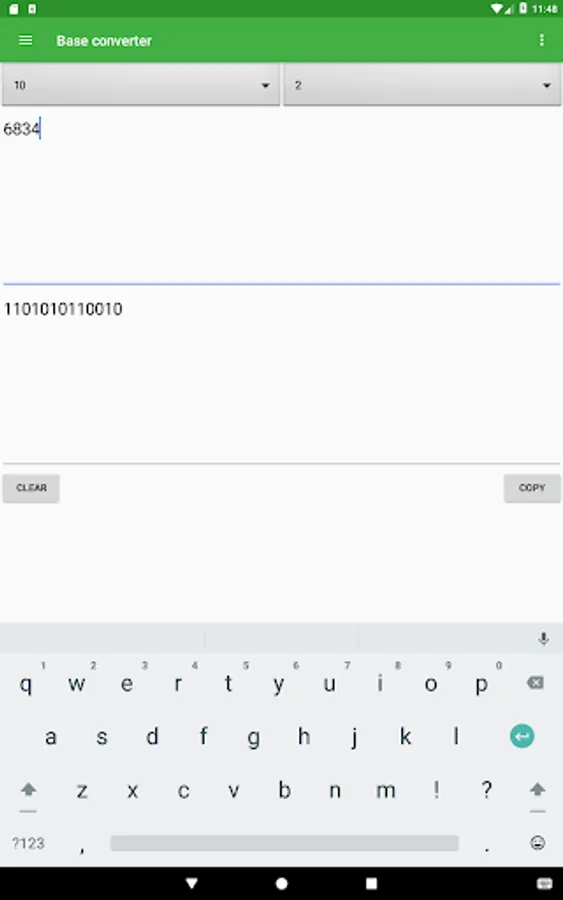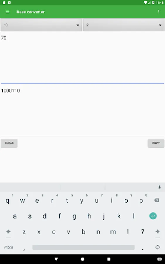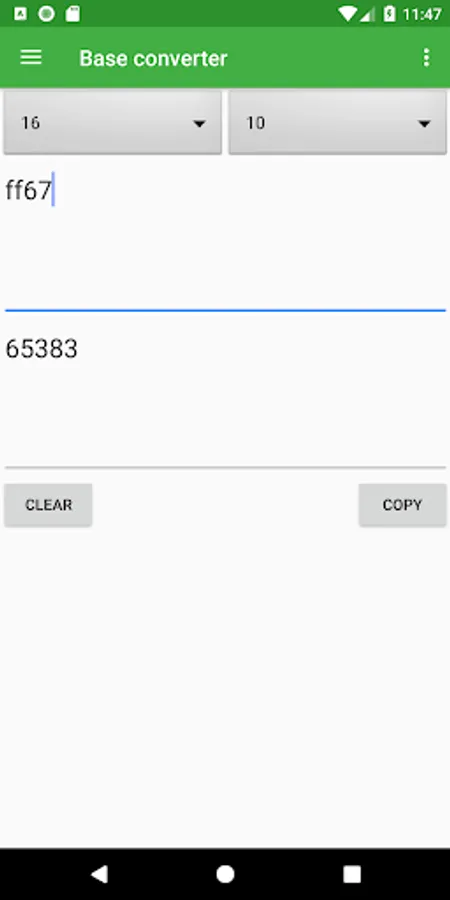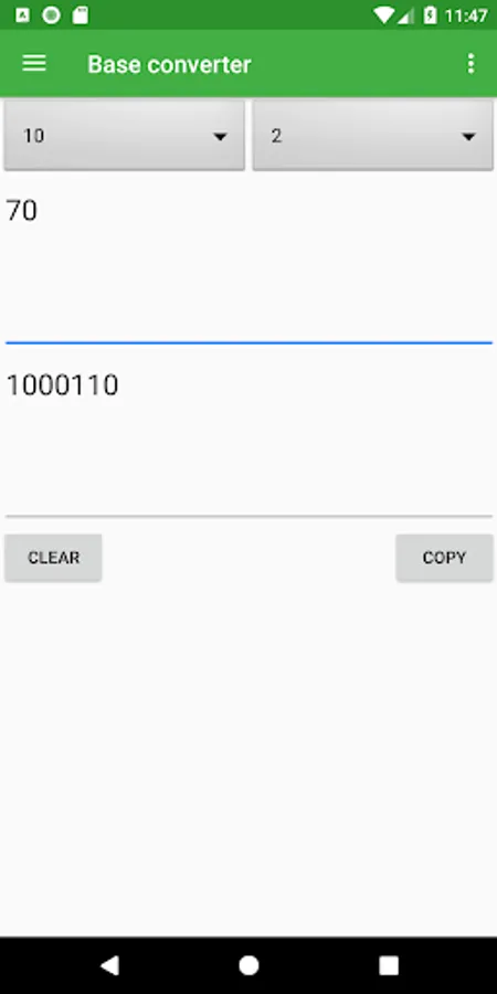 You can convert between bases by selecting the "from" base on the left and selecting the "to" base on the right. You can then enter your number and the app will convert it automatically.