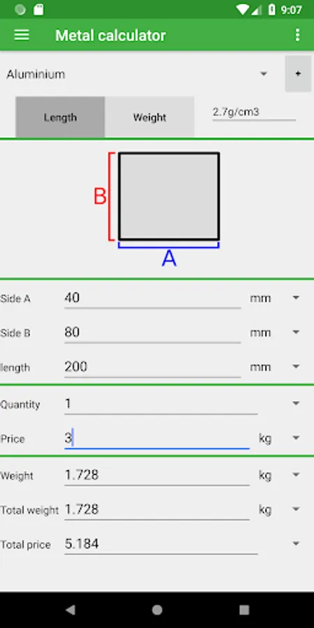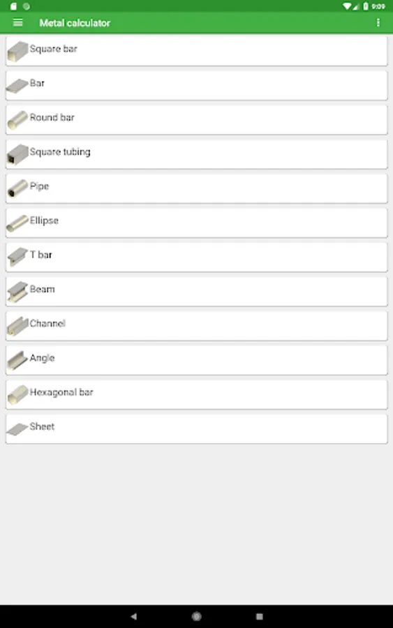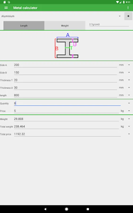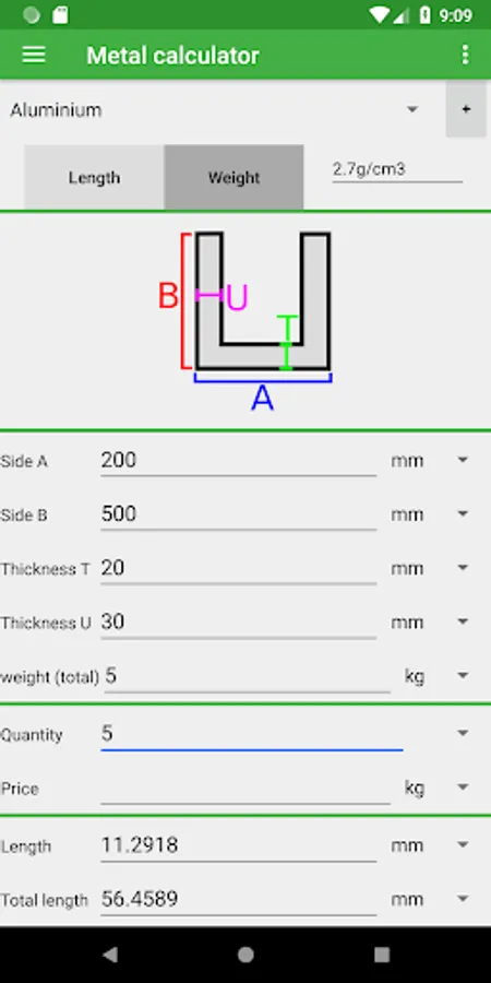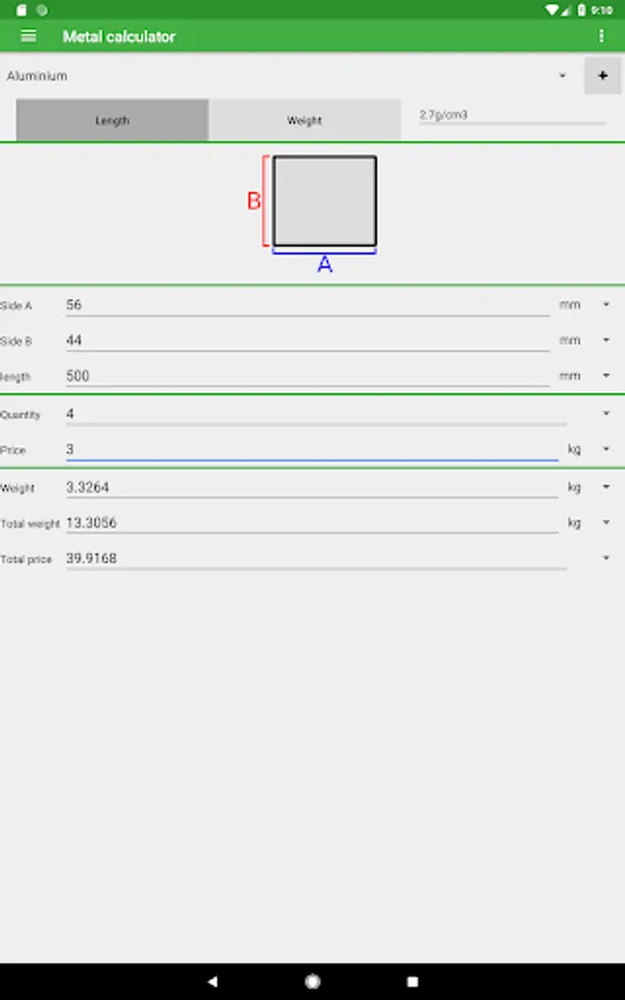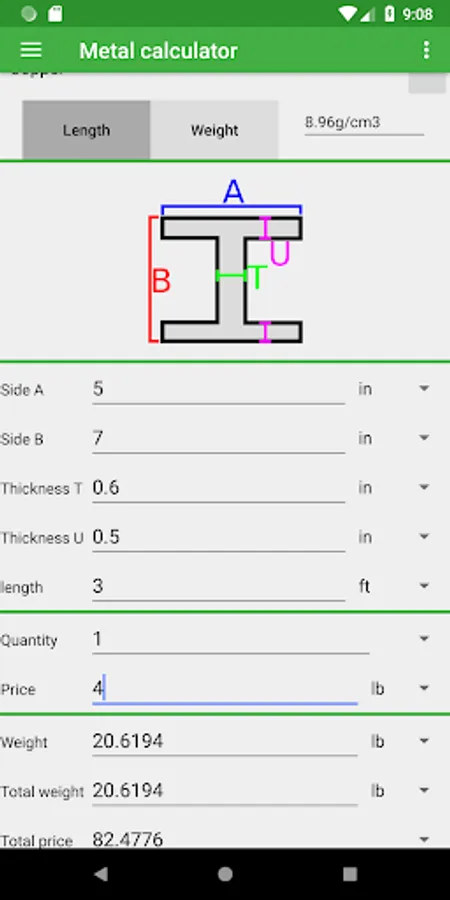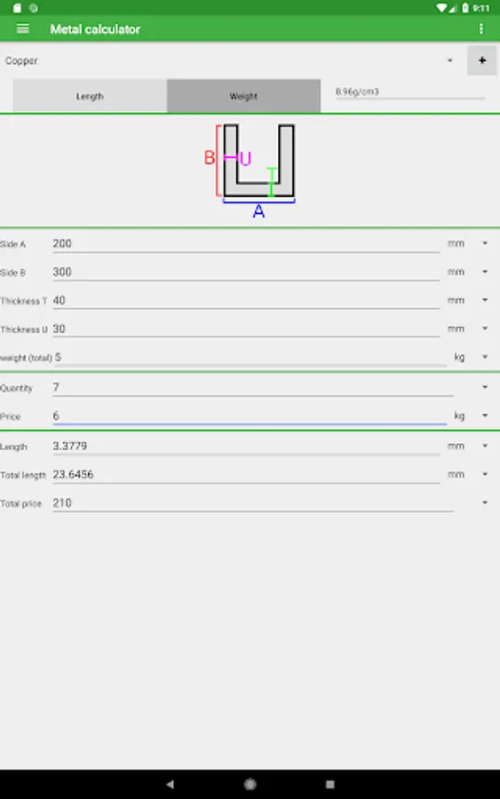 The app contains many shapes and materials to choose from. You can calculate the weight by entering the dimensions and the material your metal is made of. You can also change the quantity and add a price per unit of weight to calculate the total price.