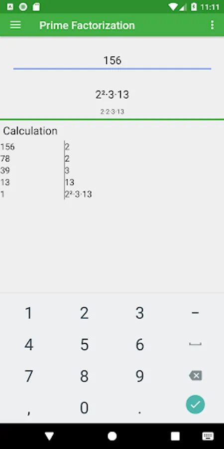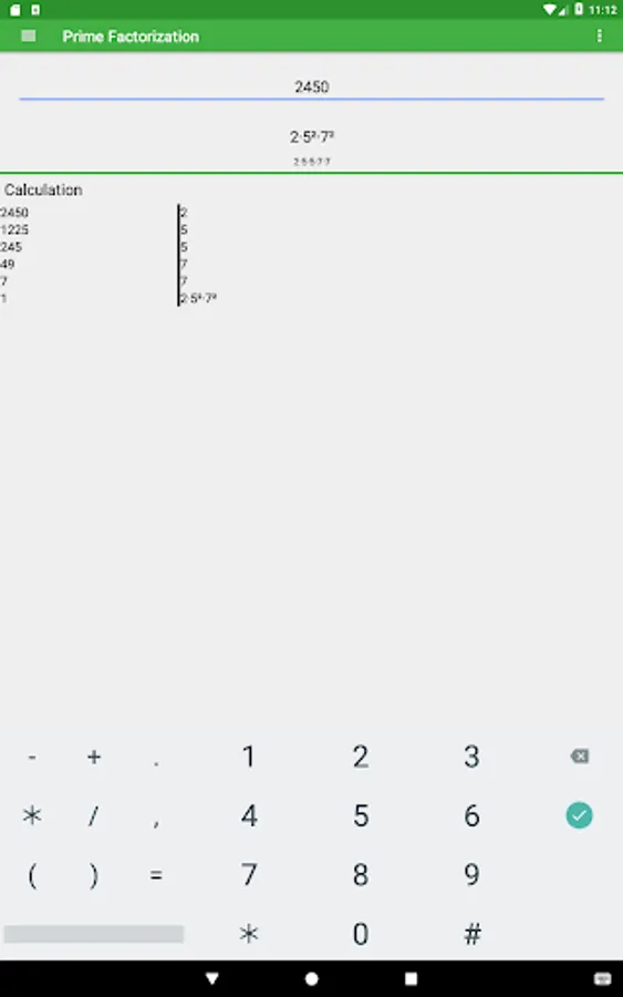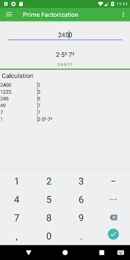 You can use this app to calculate all the prime factors of any number. Enter the number in the input and the prime factors will be calculated automatically. The app shows all the factors separate (2·2·2·7) and with powers (2³·7). The app also shows all division steps.
