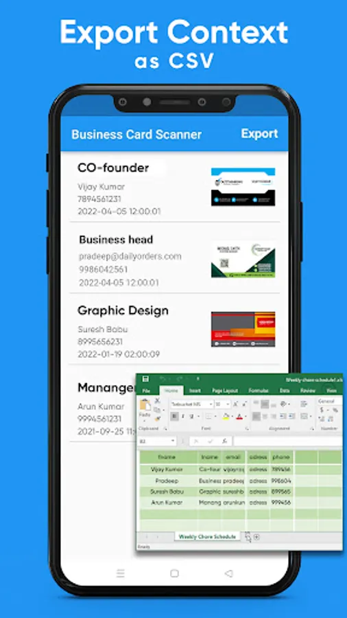 - Export business cards to Excel, and phone contacts