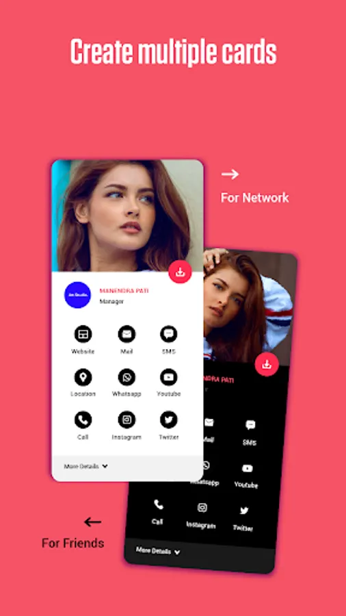 evCards - is digital business card maker also popularly known as digital visiting card maker. It helps professionals, small business owners, sales executives, corporates in creating digital business card, in organizing their contacts just like visiting card holder, in managing their teams and leads. evCard is nothing but a Virtual business card or digital business card it works as visiting card replacement, also you can call it as mini website so it is interactive business card, your client can reach you on button click using whatsapp or phone call or email also can access your social network pages in a button click. Also you can edit your digital business using using our advanced business card editor