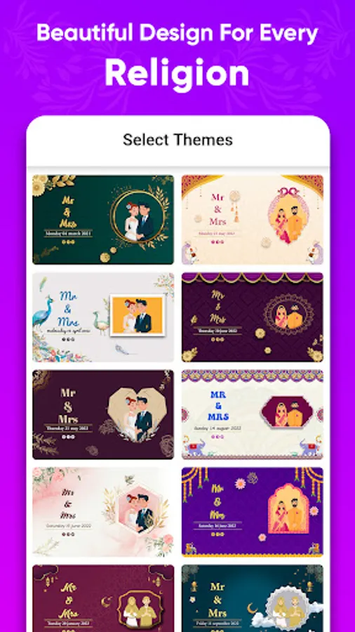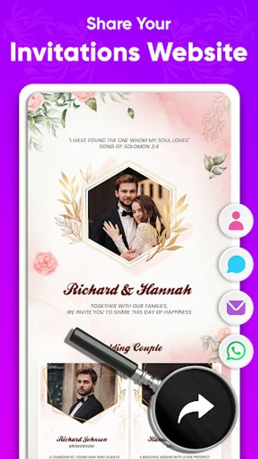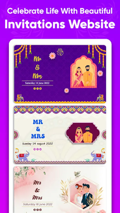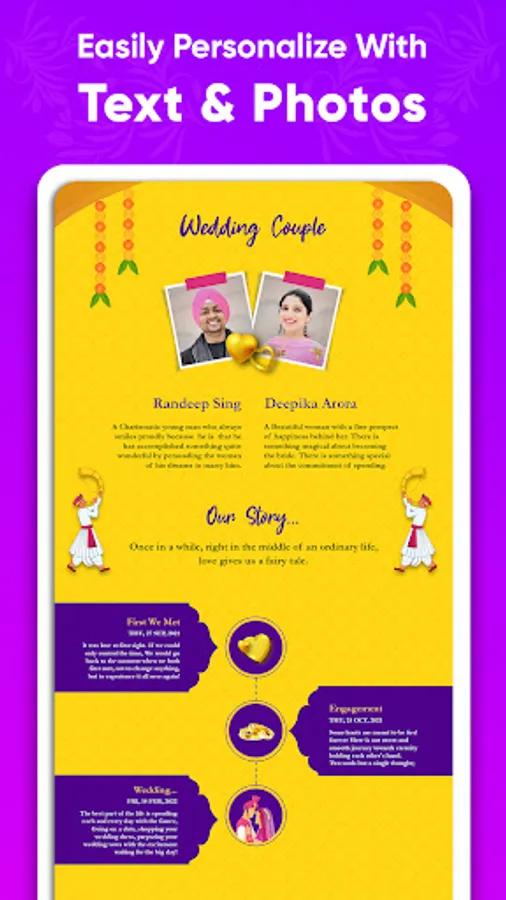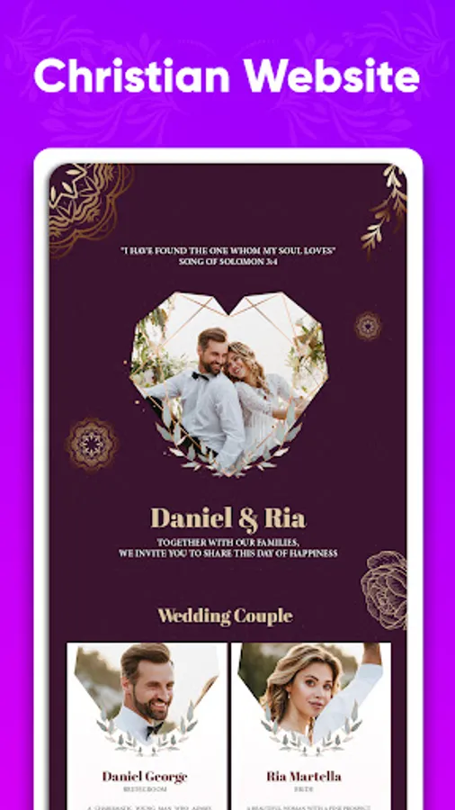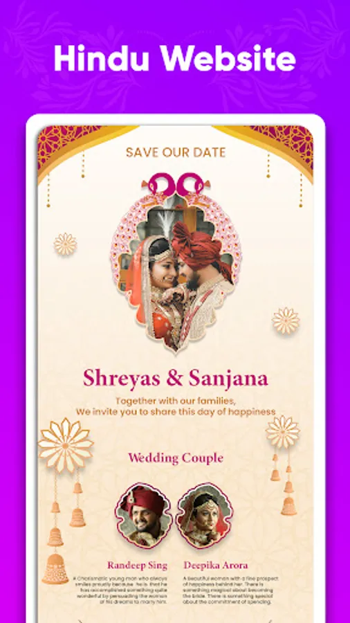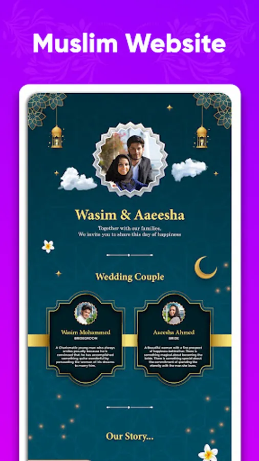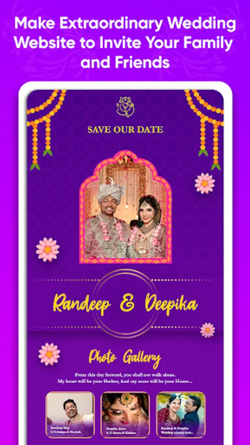 wedding website maker app allows you to create your own wedding invitation website and let you share it with all of your friends and family. Our wedding website maker contains themes for all kinds of religions like hindu, muslim, arab and christian. All of our themes are customizable with photos, pictures, images and text of your choice.