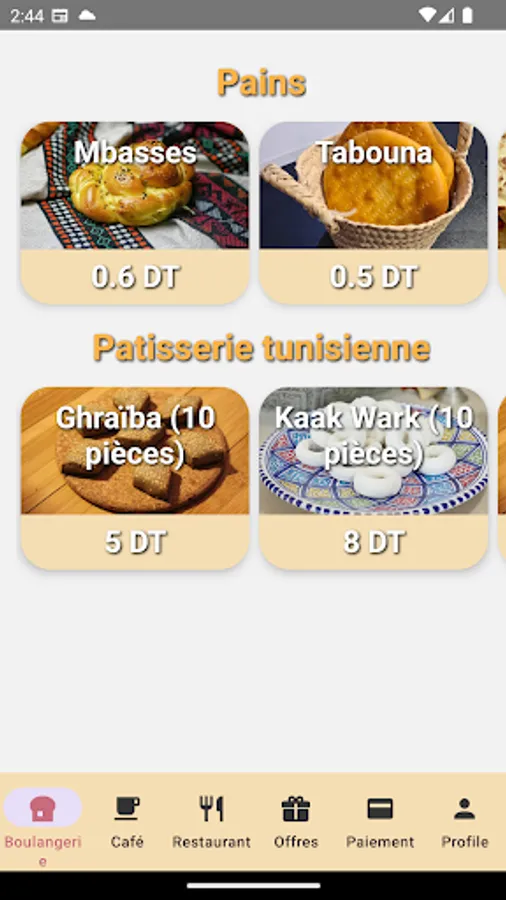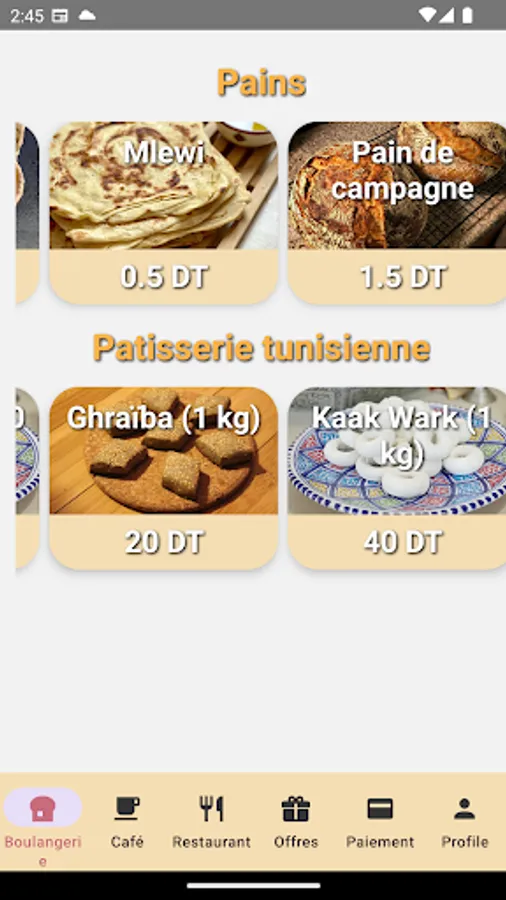Our artisanal bakery offers you fresh bread and delicious sandwiches, perfect for a quick lunch or an outdoor picnic. Our Tunisian dishes are prepared with fresh and quality ingredients, to offer you authentic flavors of Tunisia. Discover our specialties such as couscous, brik or malsouka.