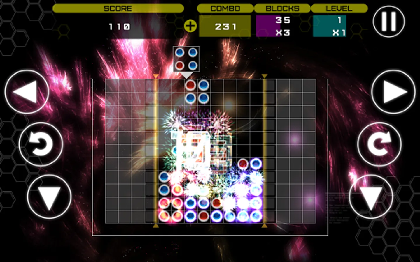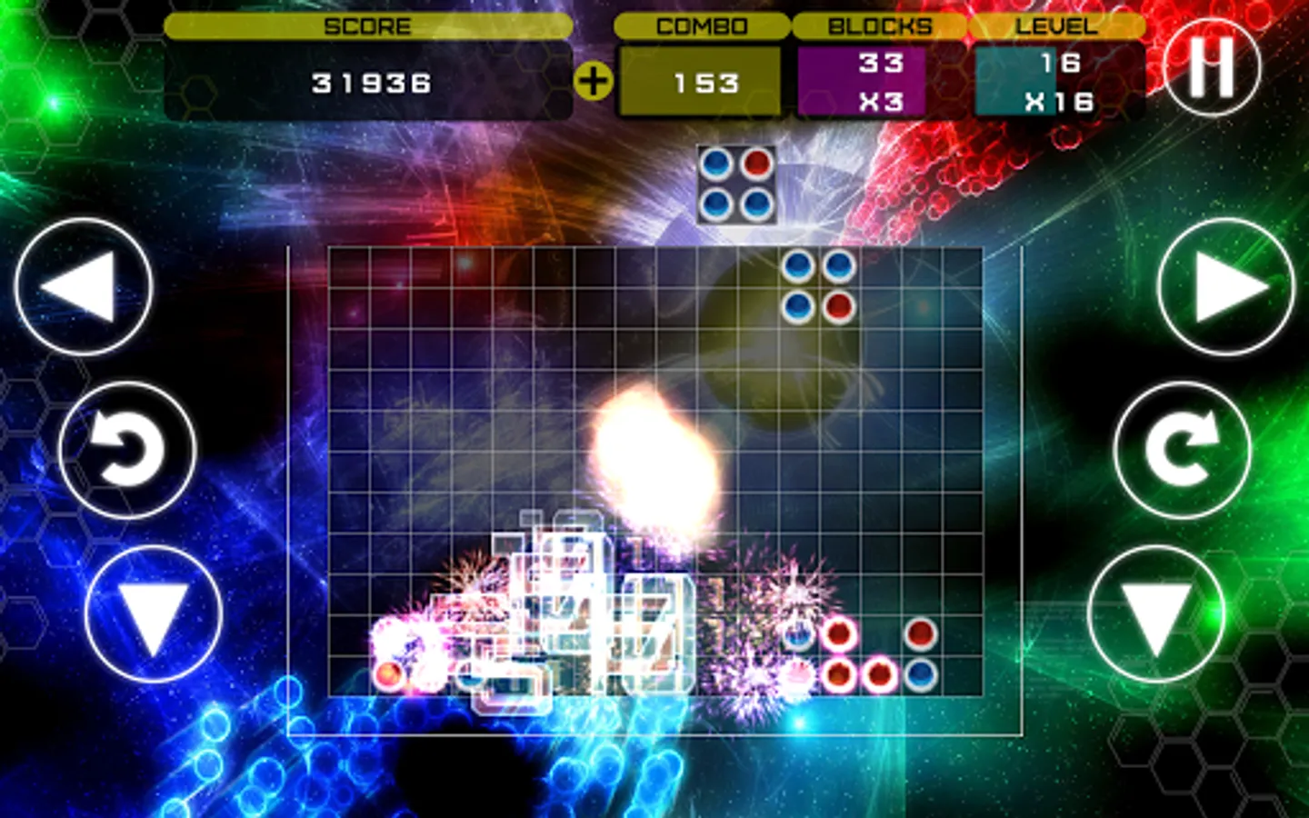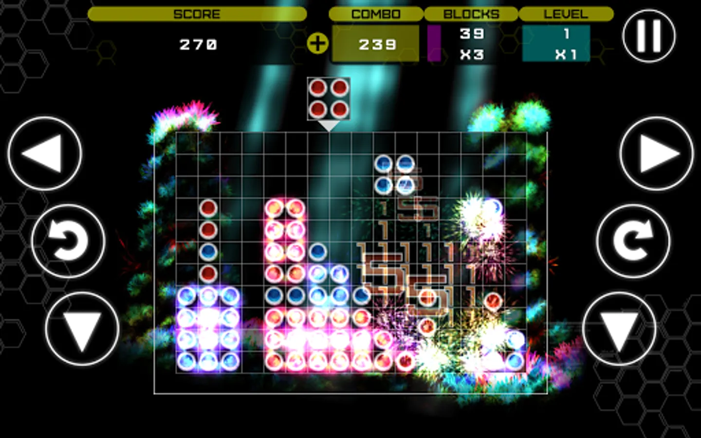- Clearing blocks triggers stunning fireworks displays!
