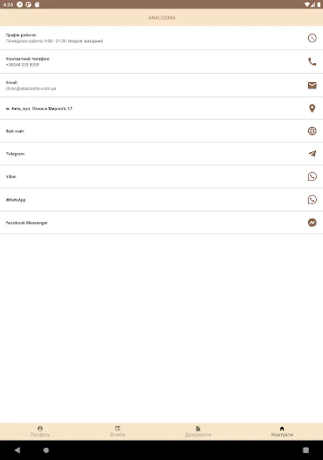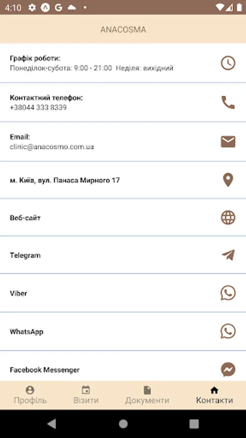 In addition, the application allows you to get acquainted with the current events in the clinic and contact the reception of the clinic through any convenient messenger.