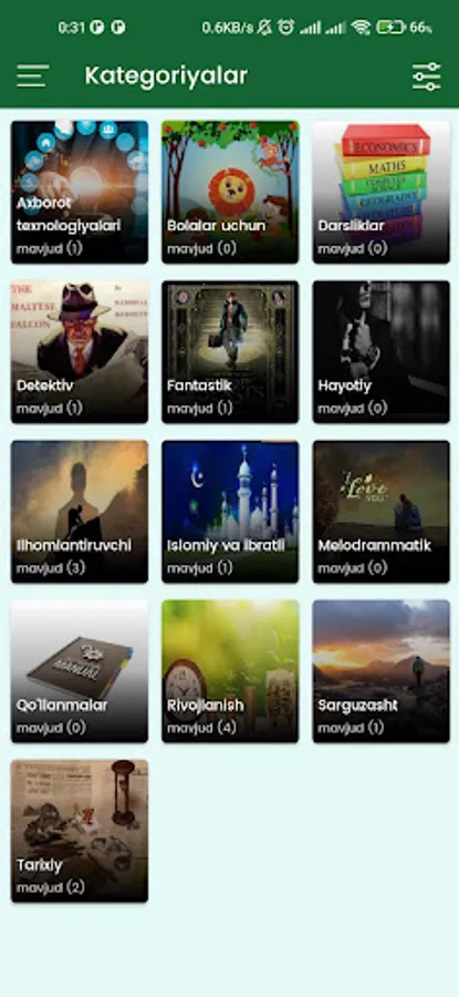 Ilovaga kiritilgan turli xil toifalar, masalan: