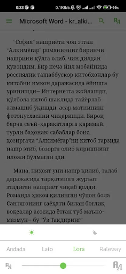 Ushbu ilovaning eng sevimli xususiyati shundaki, unda kitob o'qish uchun tungi rejim mavjud. Tungi rejim funksiyasi avtomatik ravishda ekran yorqinligini shu darajada pasaytiradiki, u ko'zlaringizdagi kuchlanishni kamaytiradi.