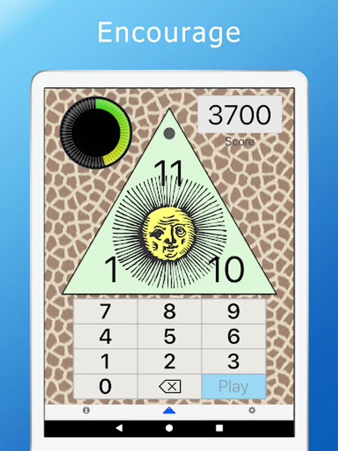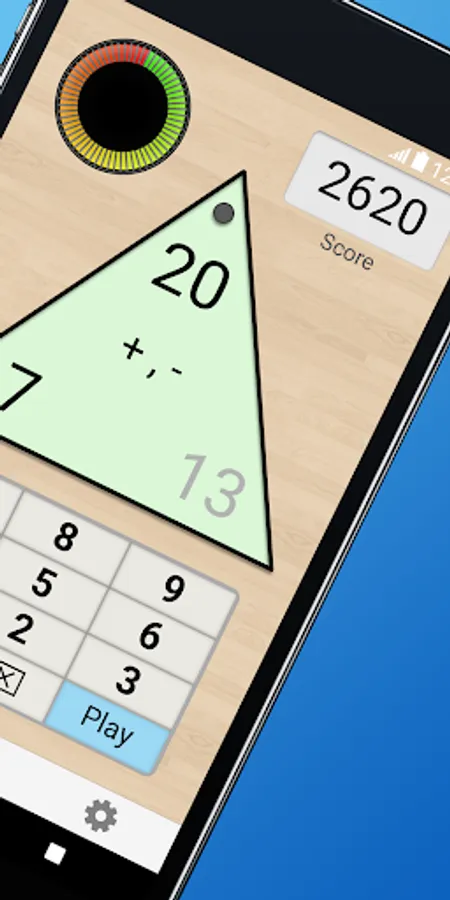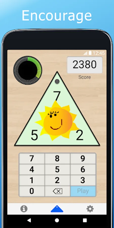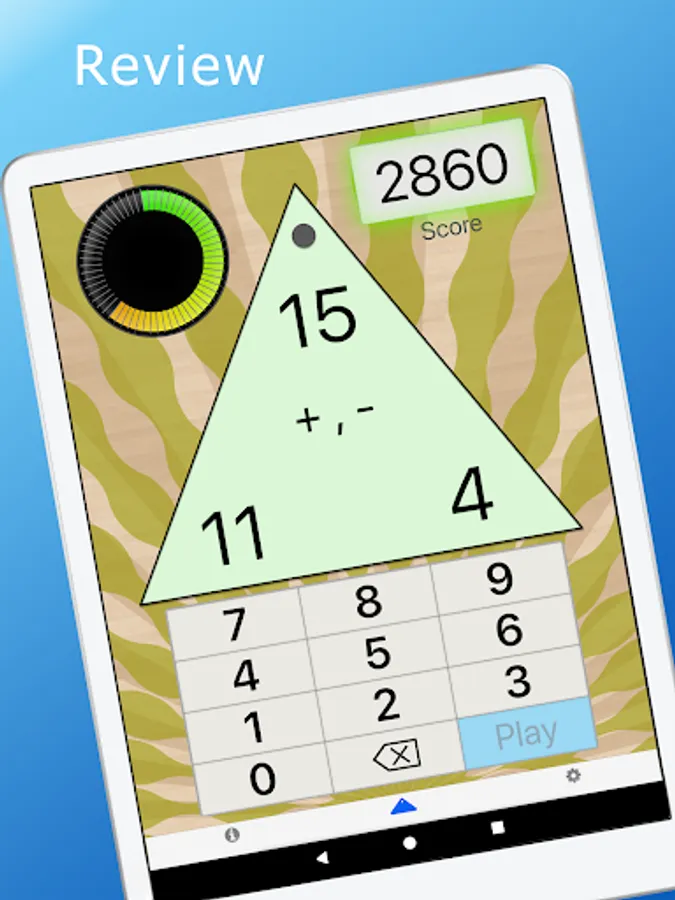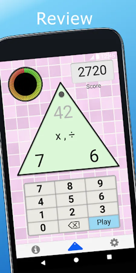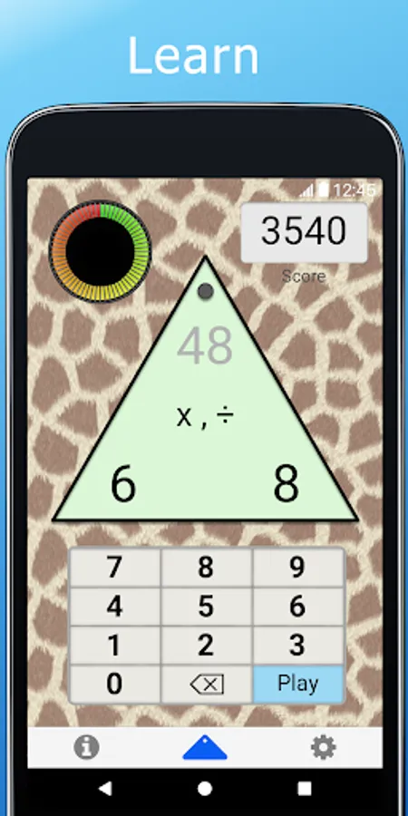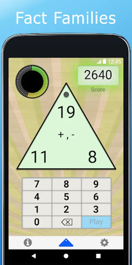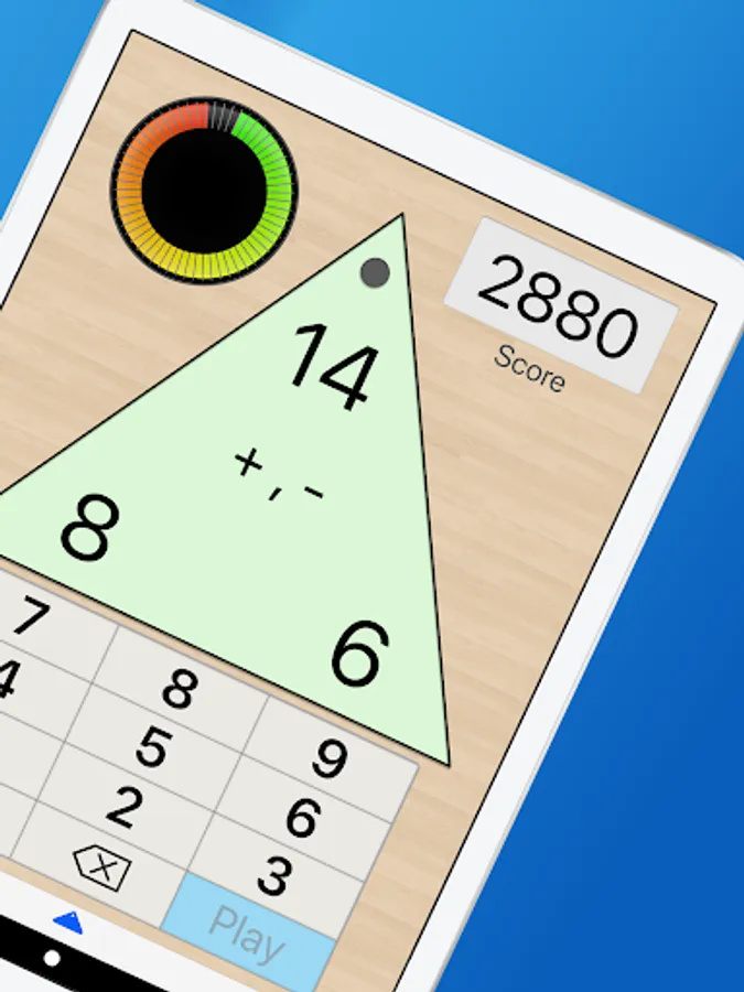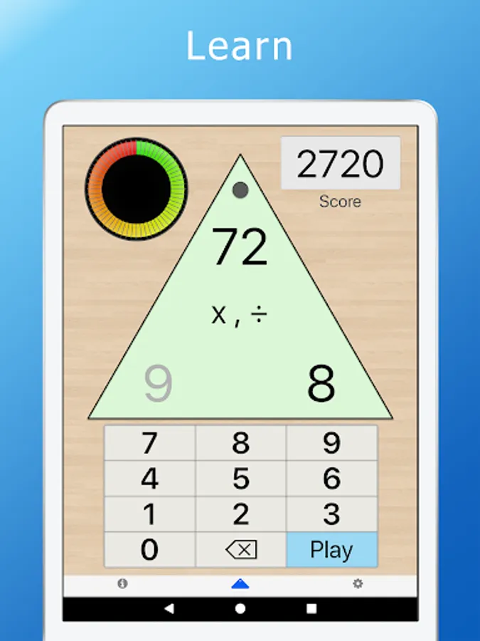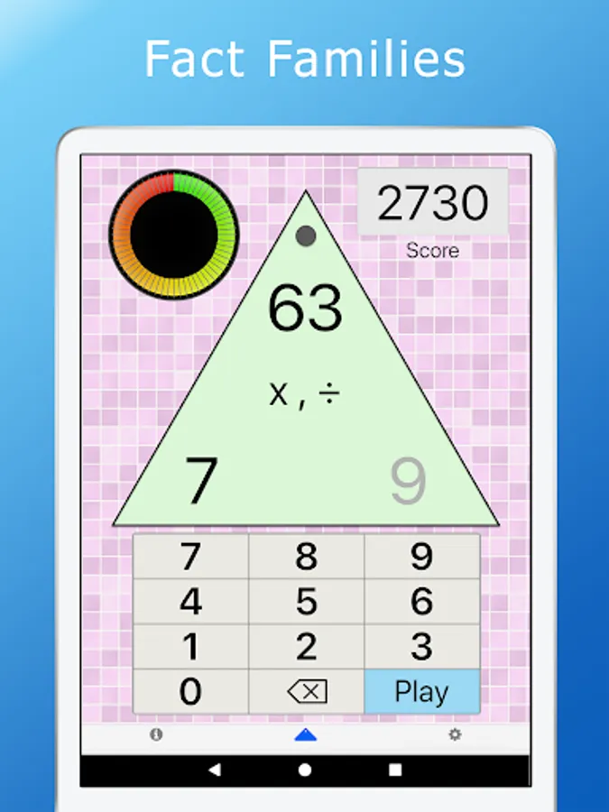 A math facts drill-and-practice program that teaches fact families for both addition/subtraction and multiplication/division. Terrific Triangle allows individual facts practice with a running score for correct answers. The player may select a difficulty level and whether to play against a timer. The triangle presents two parts of a fact family and the player must determine the missing third part. The sum and product always appear at the top of the triangle. The addends and factors always go in the two lower corners.
