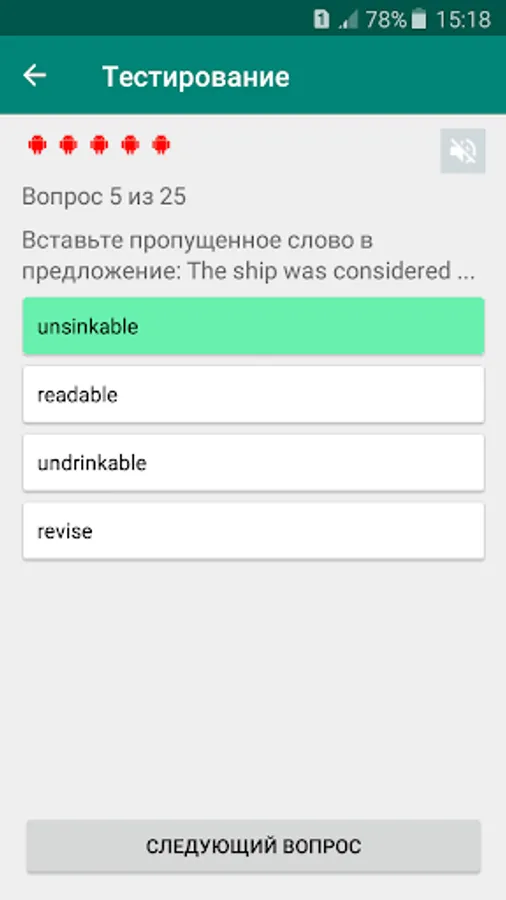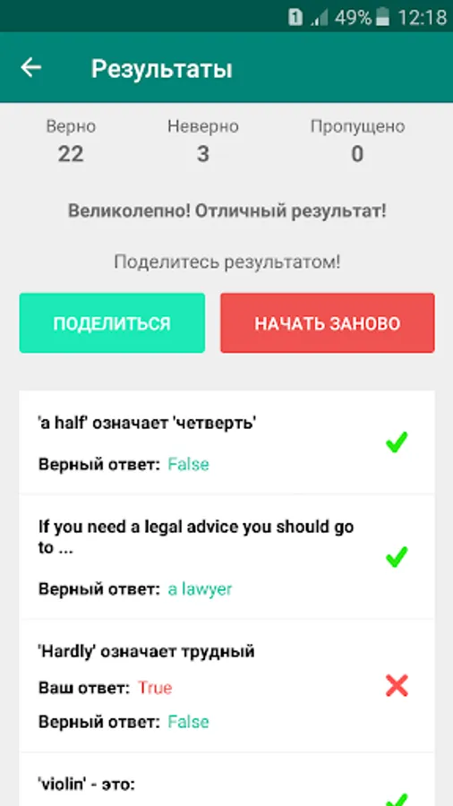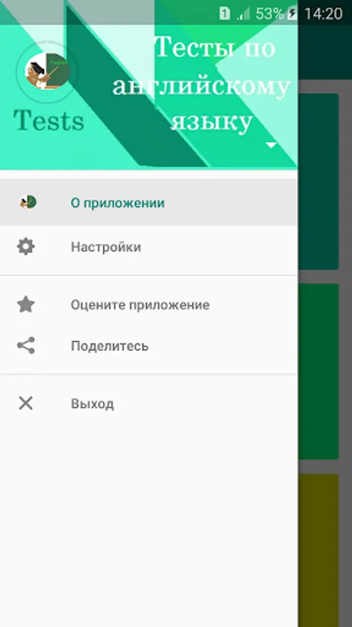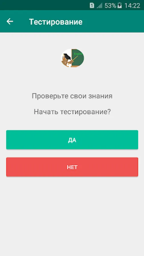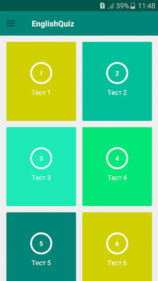 The application for the Russian-speaking audience, which offers to answer 6 tests in English (25 questions in each test). The results of each test will show the results page, correctly or not you answered each question.