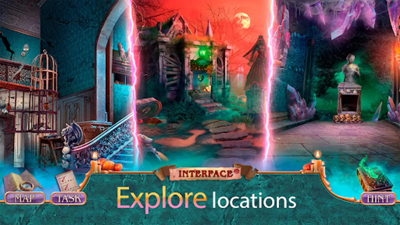 Play the halloween hidden object game, find lost items and learn who has decided to turn the world into darkness!