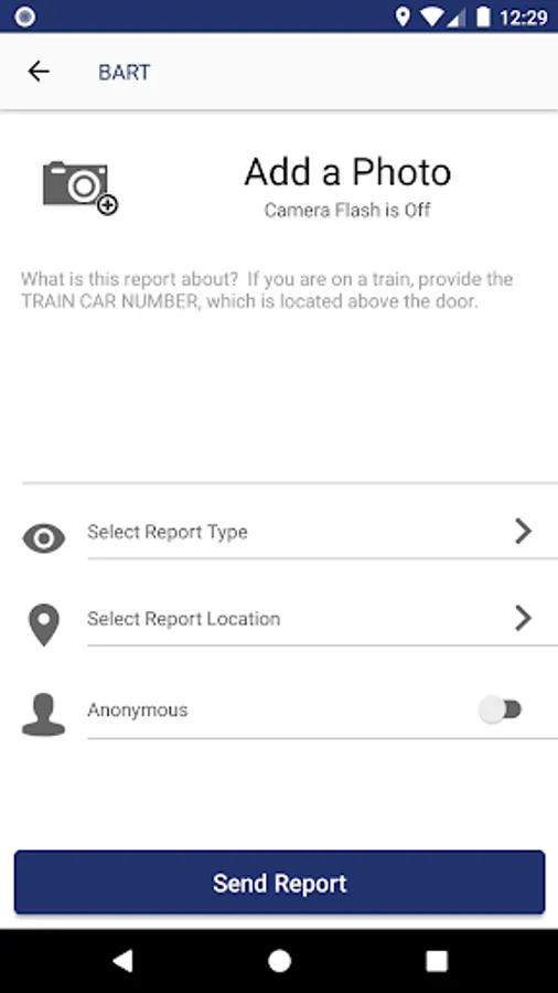 * The “Report a Problem” button allows users to send text or photos directly to BART Police. To ensure discretion, the camera flash is automatically disabled when photos are taken through the app. When reporting an issue, users can select locations and report categories to assist BART Police. Riders can also send reports anonymously if they chose.