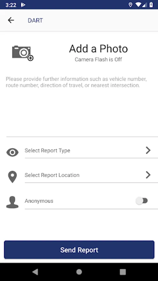 * The “Report an Incident” button allows users to send text or photos directly to Dallas Area Rapid Transit. To ensure discretion, the camera flash is automatically disabled when photos are taken through the app. When reporting an issue, users can select locations and report categories. Riders can also send reports anonymously if they choose.