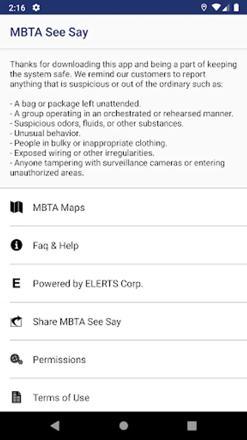 The MBTA See Say App offers riders a quick and discreet method for reporting suspicious activity directly and instantaneously to Transit Police. Using this app, riders can send the MBTA Transit Police pictures, text messages, and locations of suspicious activity.