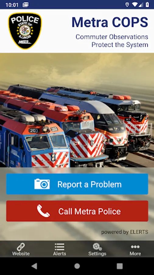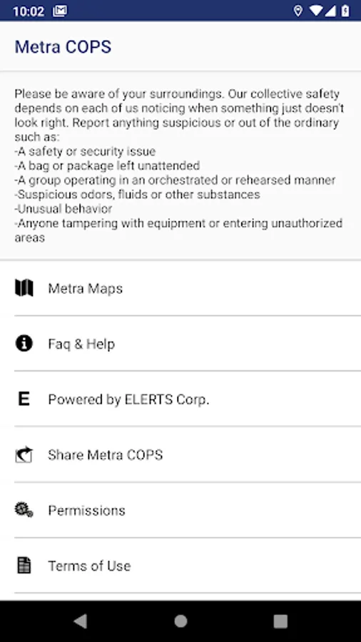 The Metra COPS Safety and Security App offers riders a quick and discreet method for reporting safety and security concerns directly to the police. App users can send photos, six second video, text descriptions, and locations of suspicious people or activities. From the home screen, users have two easy options for contacting the police: