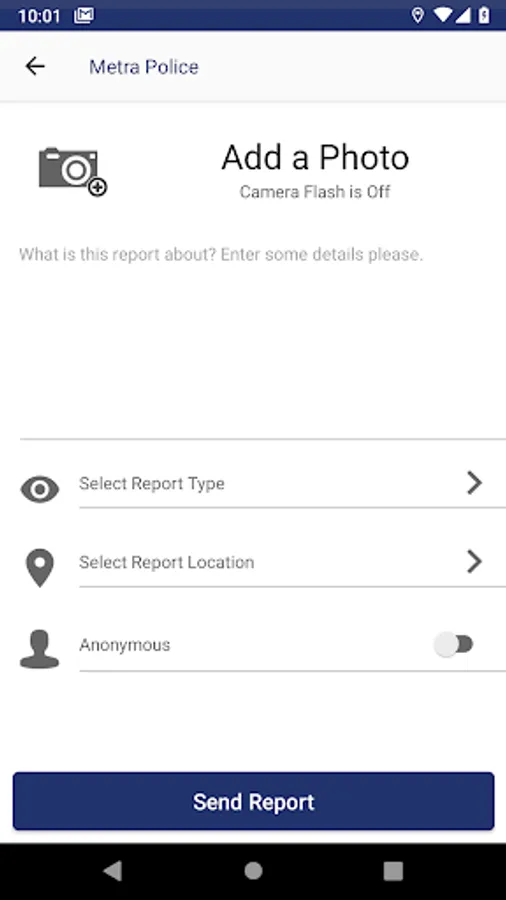 * The “Report an Issue” button allows users to send text or photos directly to the police. To ensure discretion, the camera flash is automatically disabled when photos are taken through the app. When reporting an issue, users can select locations and report categories to assist the police. Riders can also send reports anonymously if they chose.