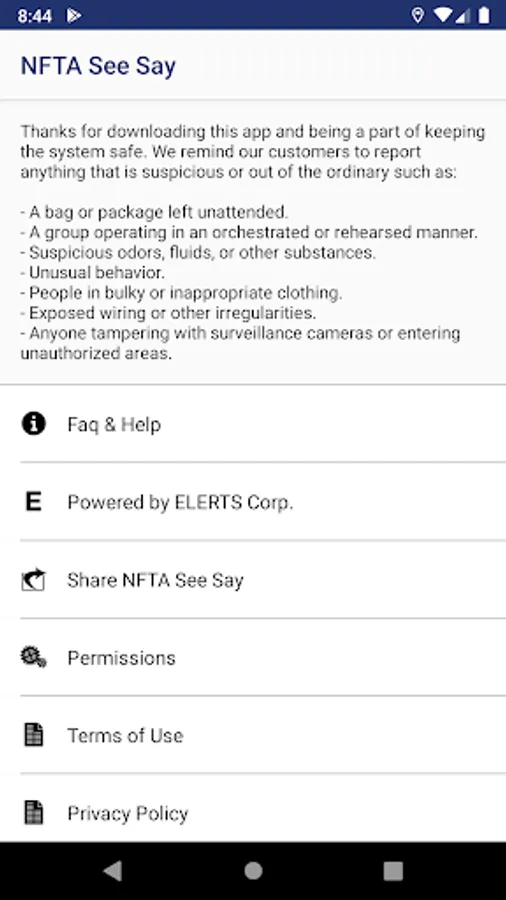 The NFTA See Say App offers the public a quick and discreet method for reporting suspicious activity directly to the NFTA Transit Police. The app can send pictures, text messages, and locations of suspicious people or activities. From the home screen, users have two easy options for contacting the NFTA Transit Police: