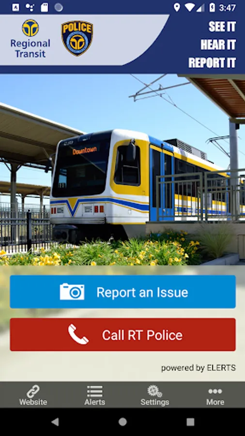 The Alert SacRT Safety and Security App offers riders a quick and discreet method for reporting safety and security concerns directly to RT Police. App users can send photos, six second video, text descriptions, and locations of suspicious people or activities. From the home screen, users have two easy options for contacting RT Police: