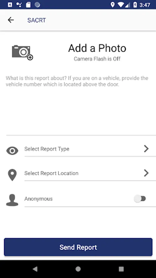 * The “Report an Issue” button allows users to send text or photos directly to RT. To ensure discretion, the camera flash is automatically disabled when photos are taken through the app. When reporting an issue, users can select locations and report categories to assist RT Police. Riders can also send reports anonymously if they chose.