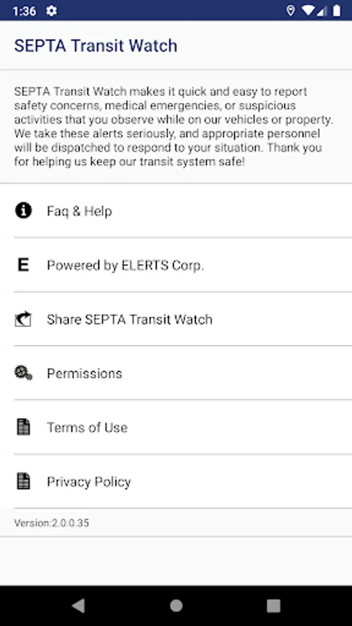 The SEPTA Transit Watch App offers the public a quick and discreet method for reporting suspicious activity directly to the police. The app can send pictures, text messages, and locations of suspicious people or activities. From the home screen, users have two easy options for contacting the SEPTA transit police: