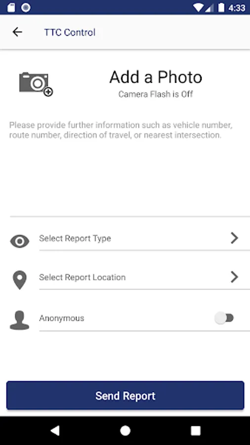 - The “Report a Problem” button allows users to send text and photos or videos directly to Transit Control. When reporting an issue, customers can select from easy drop-down menus for vehicle type (bus, streetcar or subway), route numbers, and station locations, and report categories to assist Transit Control in assessing the situation.