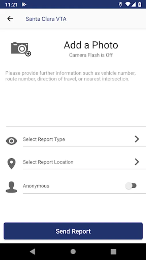 1. The “Report a Problem” button allows riders to send text or photos directly to VTA Security. To ensure discretion, the camera flash is automatically disabled when photos are taken through the app. Riders can select station locations and report categories to assist VTA Security. Riders can also send reports anonymously if they choose. If you send a report in an area without cellular connectivity, it will be stored and sent when connectivity returns. The system is also designed to send the message before pictures so that VTA Security can get App reports as quickly as possible.