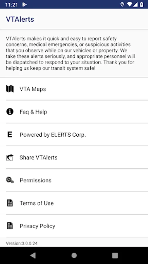 This safety application is designed for the VTA bus and light rail system in Santa Clara County in California. The VTAlerts App offers riders a quick and discreet method for reporting safety concerns and suspicious activities directly to VTA Security or, in the event of an emergency, directly to police. Riders can send VTA security pictures, text messages, and locations of suspicious persons and/or activities making riding safer and more comfortable for all.