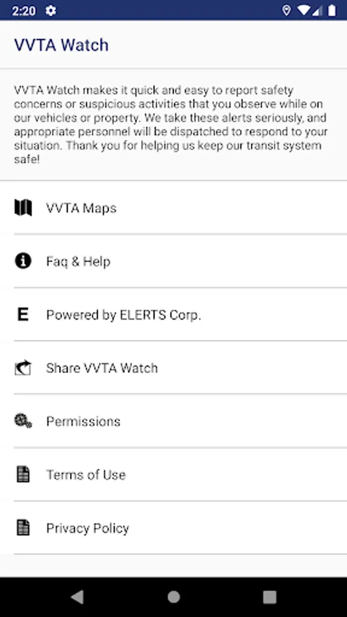 The VVTA Watch Safety and Security App offers riders a quick and discreet method for reporting concerns directly to Victor Valley Transit. App users can send photos, six second video, text descriptions, and locations of suspicious people or activities. From the home screen, users have two easy options for contacting Victor Valley Transit: