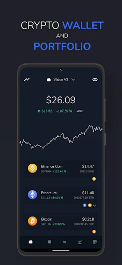 Vision helps you to keep track of your crypto and gives you an overview of your portfolio. With the help of its integrated wallet, it is possible to receive, send, and hold crypto including the most favorite blockchains - Bitcoin, Ethereum, and Binance Smart Chain!