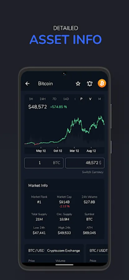 The portfolio gives you a complete overview of your cryptocurrencies. The chart shows you how the price has developed and how much you have gained or lost in a certain period. Additionally, you can view your account balance in many different fiat currencies.