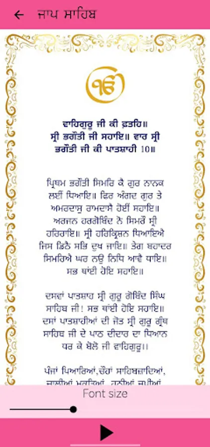 Jaap Sahib is the morning prayer of the Sikhs. The prayers were composed by the Tenth Sikh Guru, Guru Gobind Singh Ji and is found at the start of the Sikh scripture Dasam Granth.This Bani is an important Sikh prayer and it is a part of a Sikh's Nitnem.