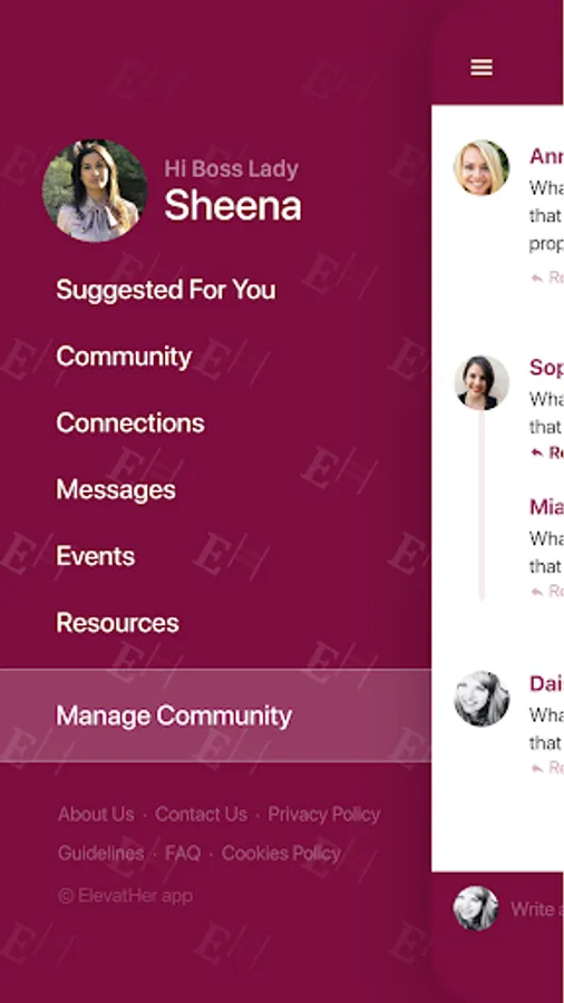 Empowered Women, Empower Women! We present ElevatHer, an individually tailored networking app uniting members through four key criteria: events, career, proximity and hobbies. ElevatHer is an app for women by women to build on a network based on professional skills and knowledge. Building connections is the first step in climbing the career ladder, so help us help you in taking that first step! The app is designed to be a hub where members can regroup and reinvest in themselves at all stages of their career.
